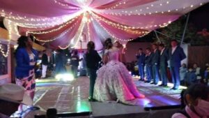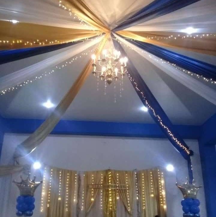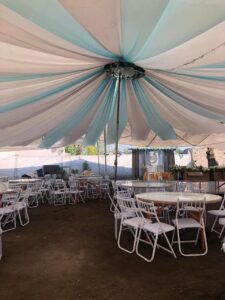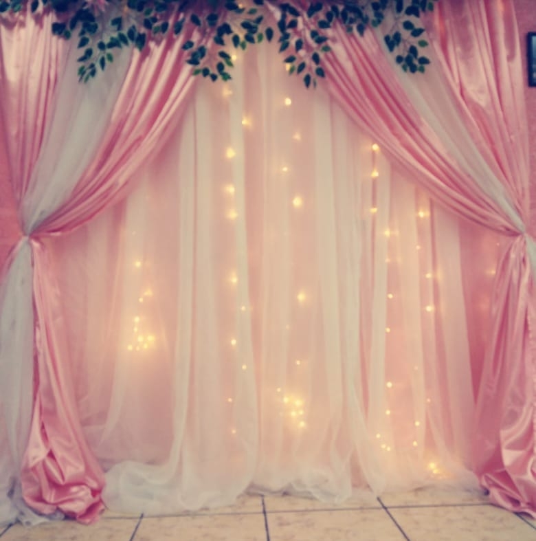 Decoración con flor, telas aéreas, mesa de dulces, servicio del barman etc